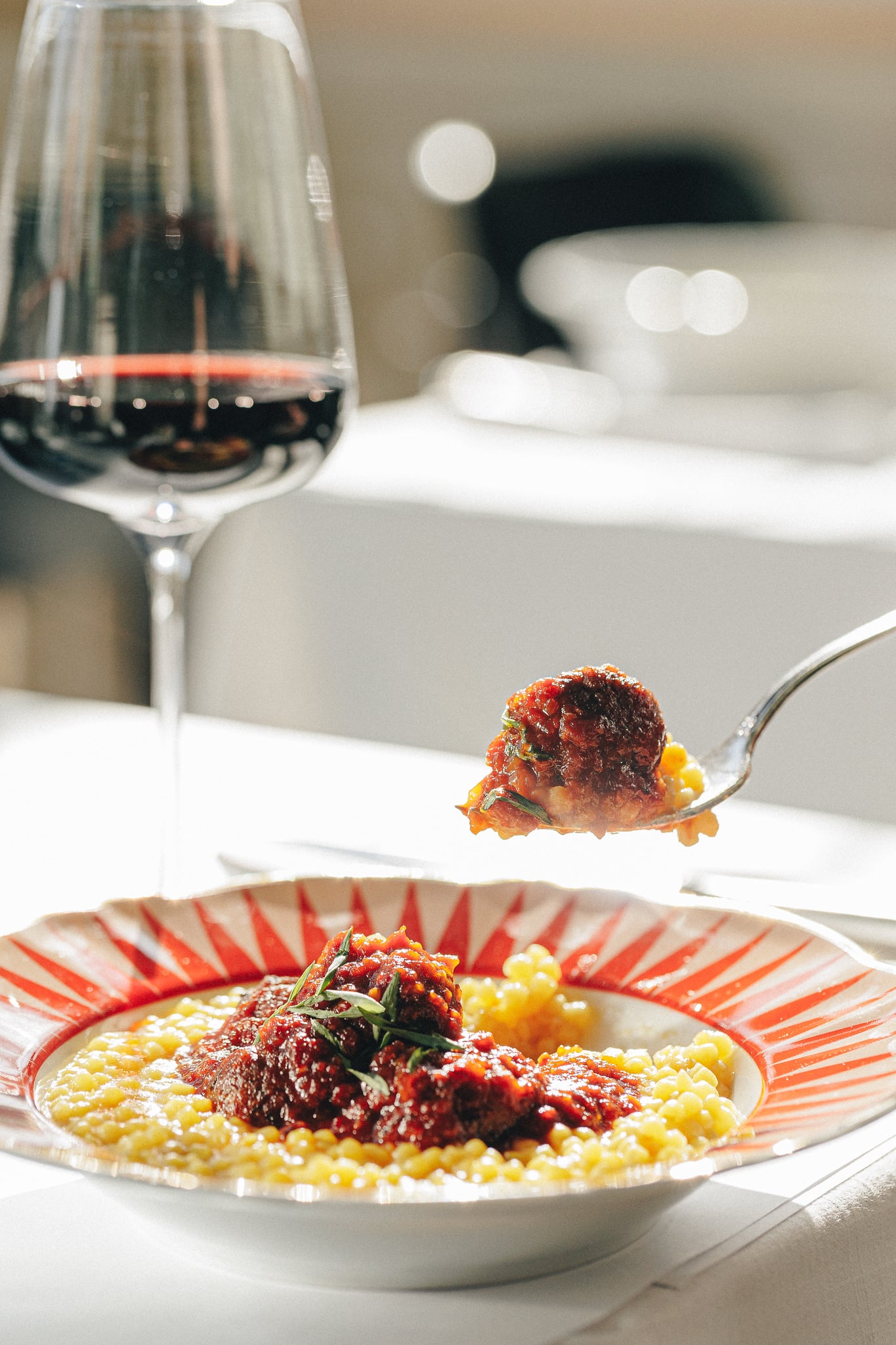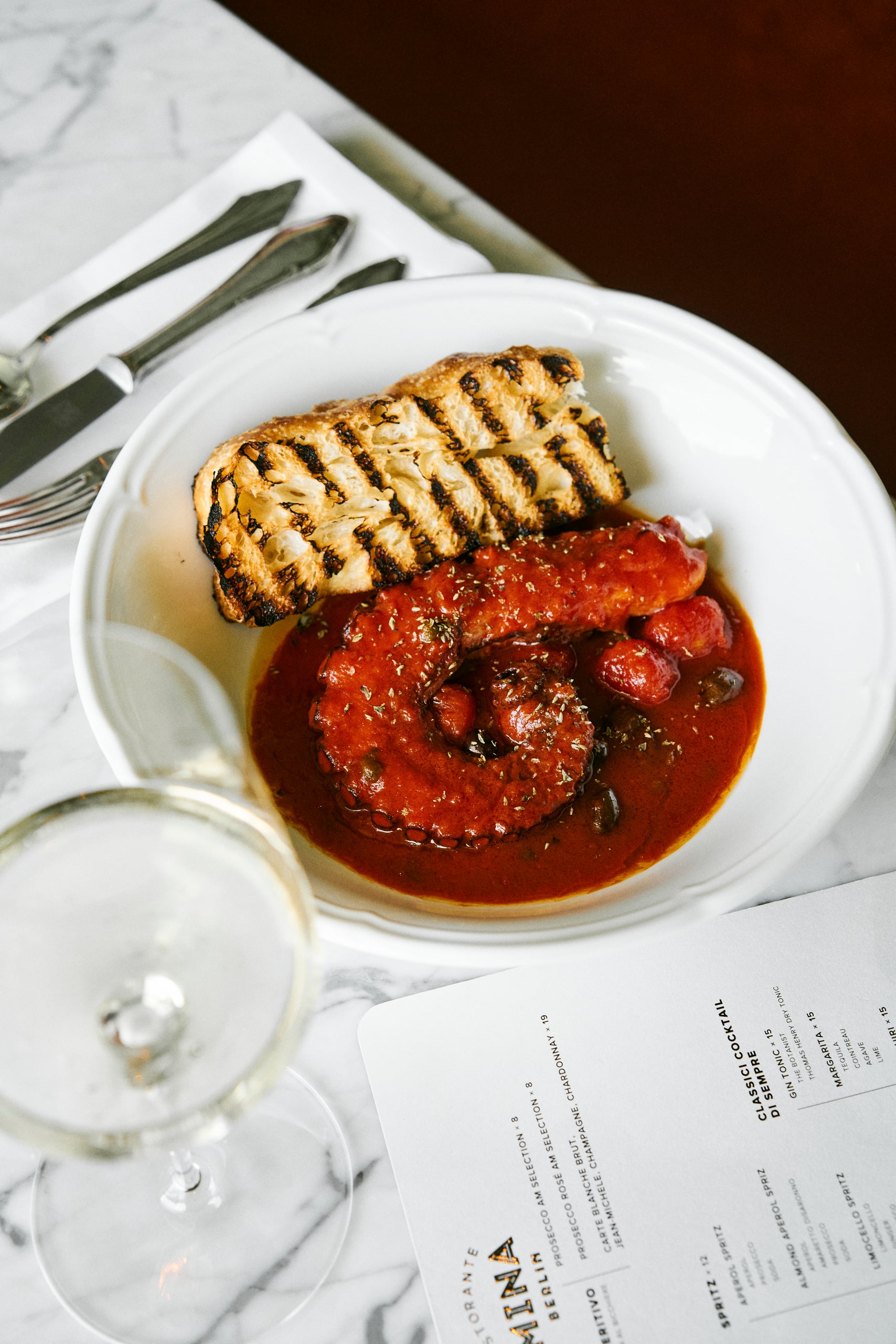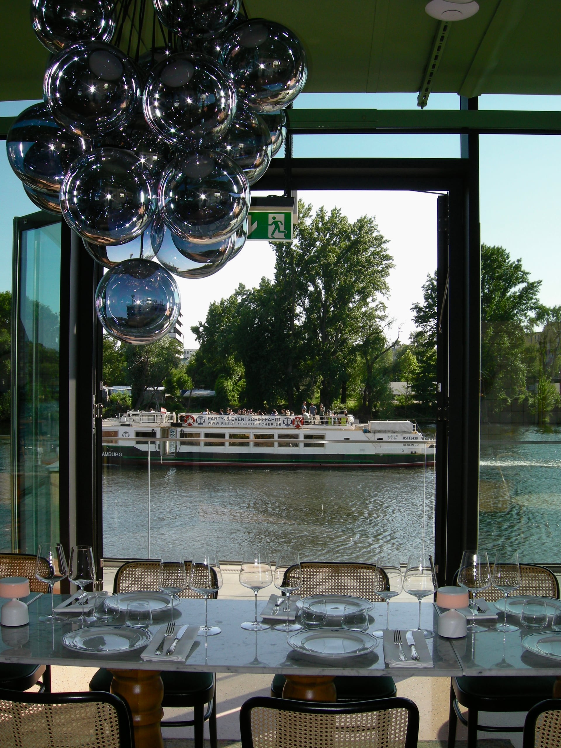 An exclusive private room with its terrace overlooking sunsets over the Spree, impeccable interior design, and tasty Italian food with a Levantine twist presented on bright Florentine Bitossi porcelain.