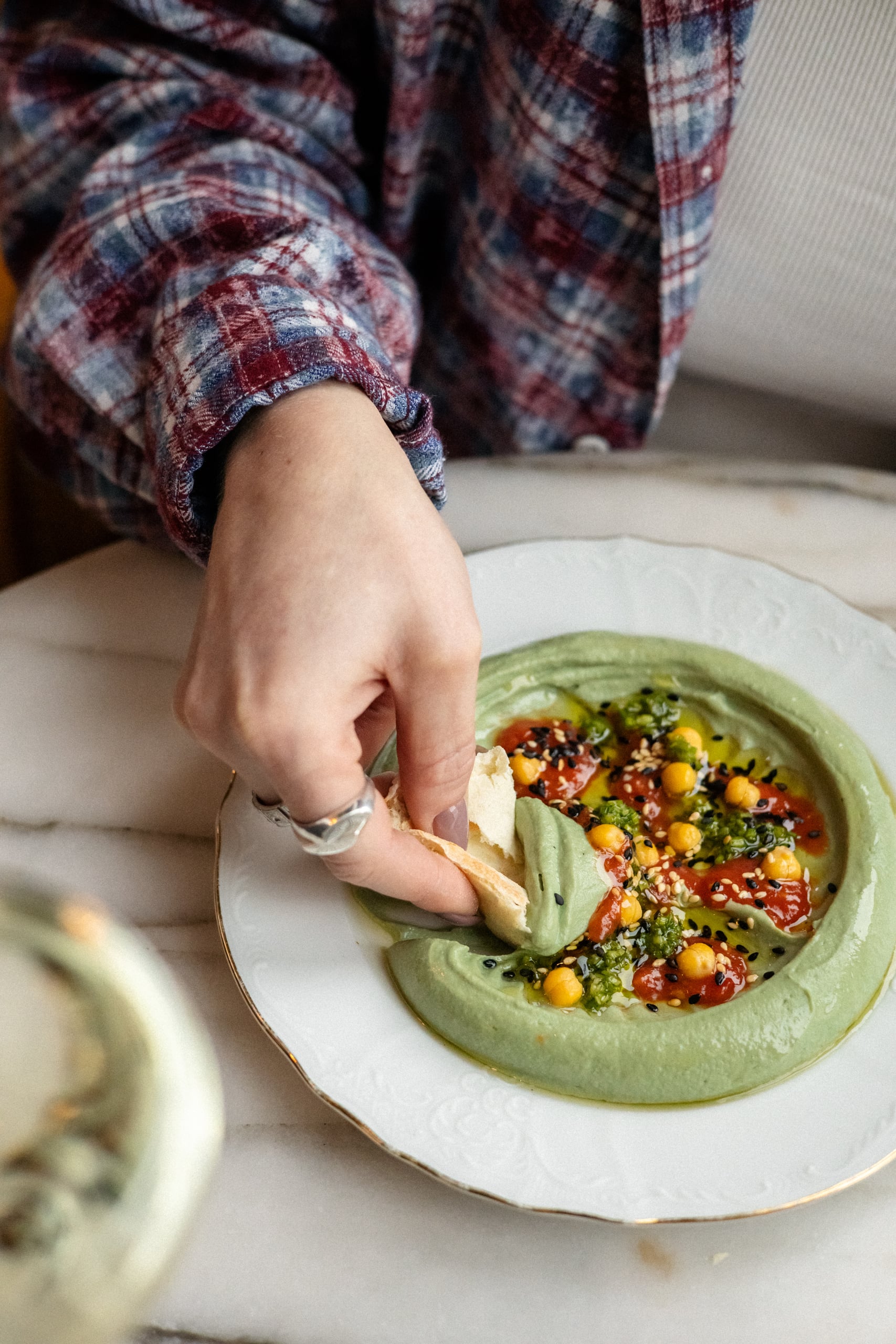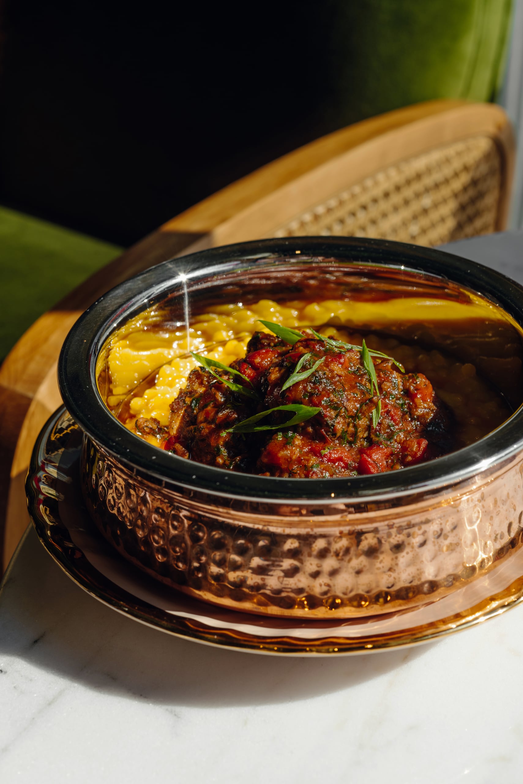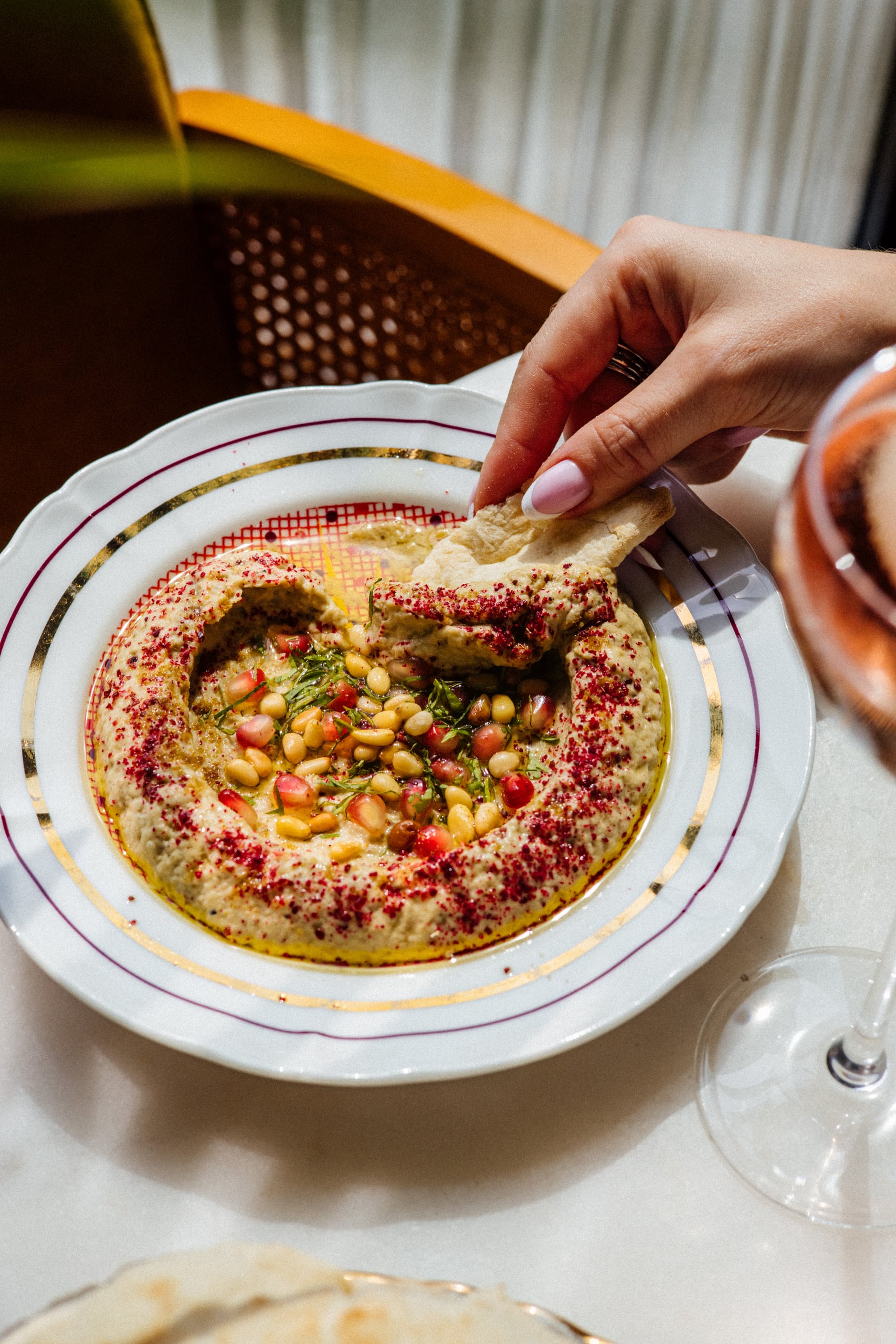 An exclusive private room with its terrace overlooking sunsets over the Spree, impeccable interior design, and tasty Italian food with a Levantine twist presented on bright Florentine Bitossi porcelain.